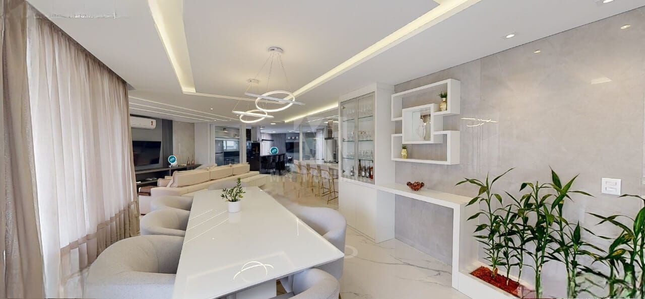 1 Suíte, escritório, sala de estar, sala social, sala de jantar, espaço Gourmet e churrasqueira, cozinha em conceito aberto e espaço gourmet, mobiliado com eletrodoméstico novos e modernos, armários planejados, dispensa oculta, bancadas em porcelanato, churrasqueira, adega, cervejeira, fogão de indução, coifa, lava louças e Tv, lavanderia com bancada em granito, armários planejados, máquinas de lavar e secar (secagem a gás) esquadrias e portas em PVC, portas internas em madeira.